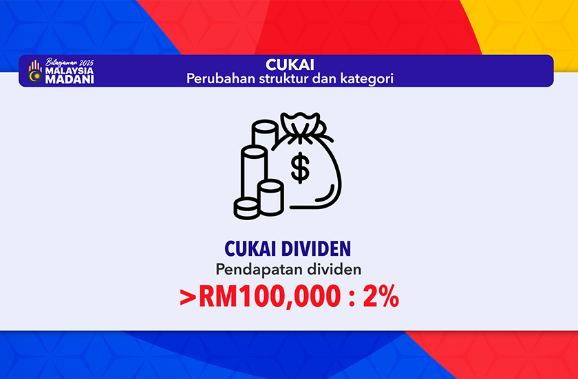Anwar yang juga Menteri Kewangan berkata kerajaan bercadang meluaskan asas cukai secara progresif dengan memperkenalkan cukai dividen pada kadar dua peratus ke atas pendapatan dividen melebihi RM100,000 yang diterima oleh pemegang saham individu bermula tahun taksiran 2025.
