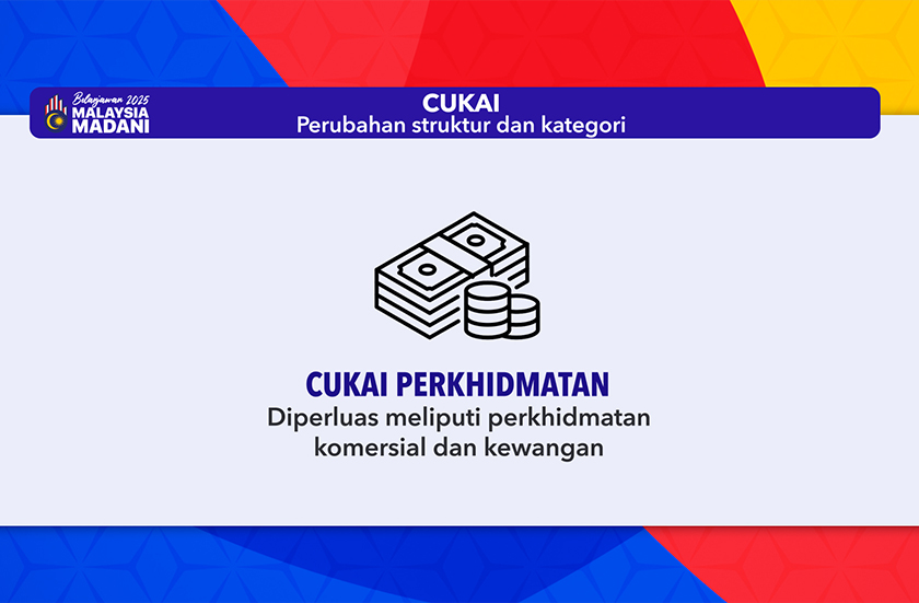 KUALA LUMPUR: Kerajaan akan memperluaskan skop Cukai Perkhidmatan meliputi perkhidmatan komersial antaranya perniagaan seperti perkhidmatan kewangan berasaskan fi.