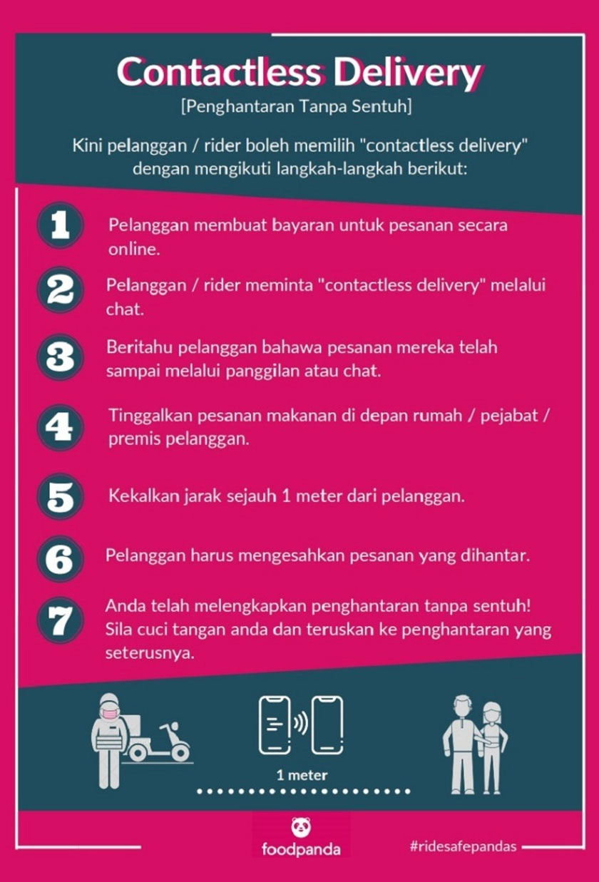 Perkhidmatan penghantaran makanan, foodpanda akan melaksanakan “contactless delivery” ataupun penghantaran tanpa sentuh sepanjang pelaksanaan Perintah Kawalan Pergerakan bermula Rabu ini .