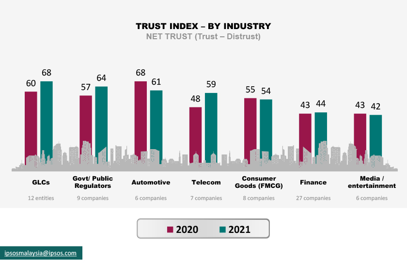 Selain itu, syarikat-syarikat berkaitan kerajaan, pengawal selia kerajaan, dan entiti telekomunikasi dilihat mengalami peningkatan kepercayaan yang signifikan.