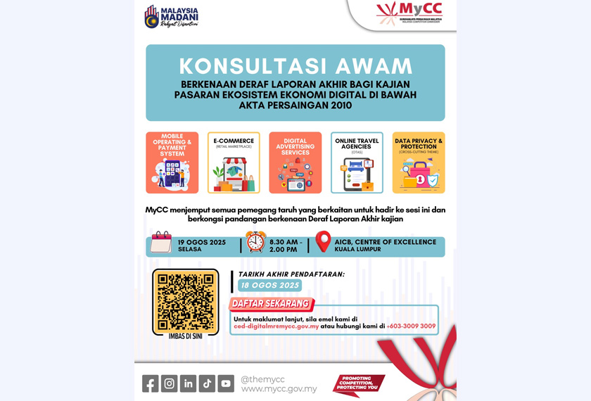 KUALA LUMPUR: Suruhanjaya Persaingan Malaysia (MyCC) akan menganjurkan sesi konsultasi awam kedua bagi deraf laporan akhir Kajian Pasaran Ekosistem Ekonomi Digital pada 19 Ogos ini, sebagai sebahagian daripada usaha memperkukuh amalan persaingan sihat dalam sektor digital negara.