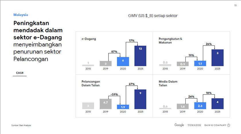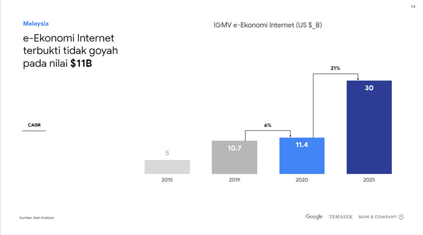 Beliau berkata menjelang tahun 2025, jangkaan keseluruhan nilai e-ekonomi akan mencapai AS$30 bilion (RM123.6 bilion) dengan Kadar Pertumbuhan Tahunan Kompaun (CAGR) memecut semula kepada 23 peratus.