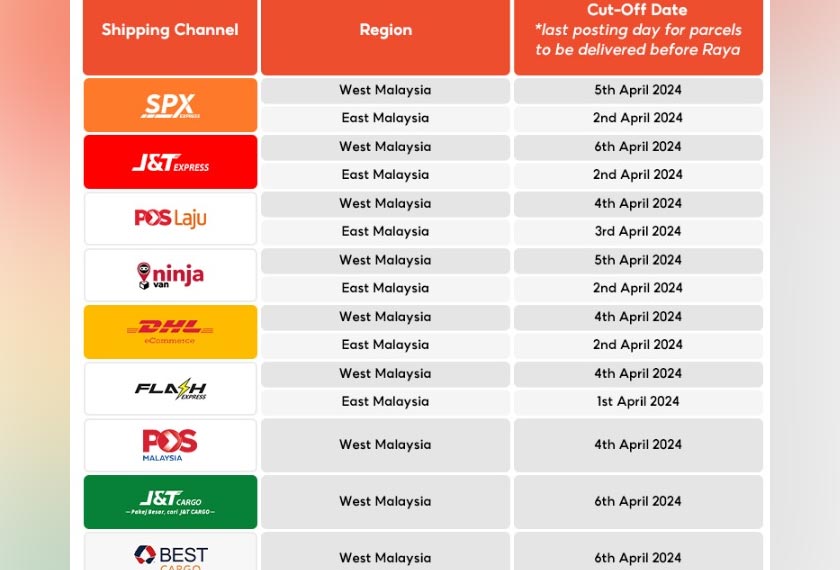 Pelbagai syarikat kurier dan logistik telah disenaraikan dengan masing-masing menetapkan tarikh akhir penghantaran di antara 4 dan 6 April 2024 untuk Semenanjung Malaysia, manakala untuk Sabah dan Sarawak dari 1 hingga 3 April 2024.
