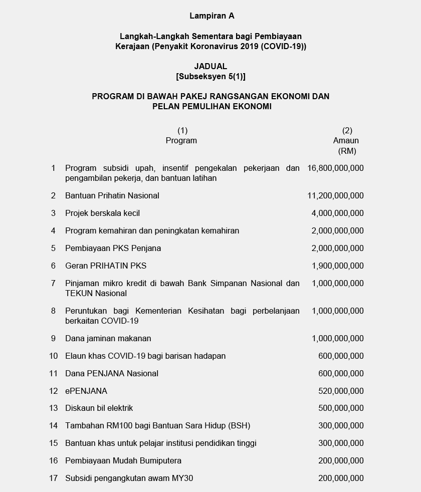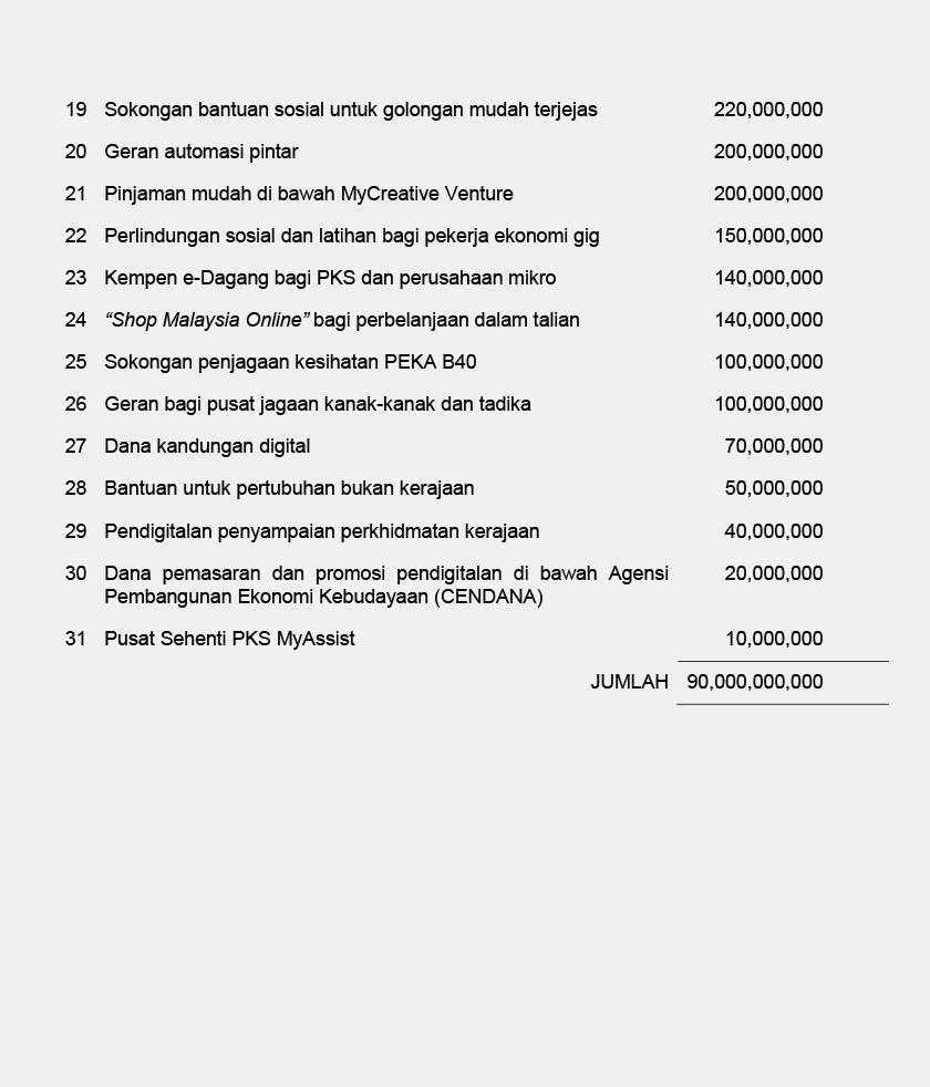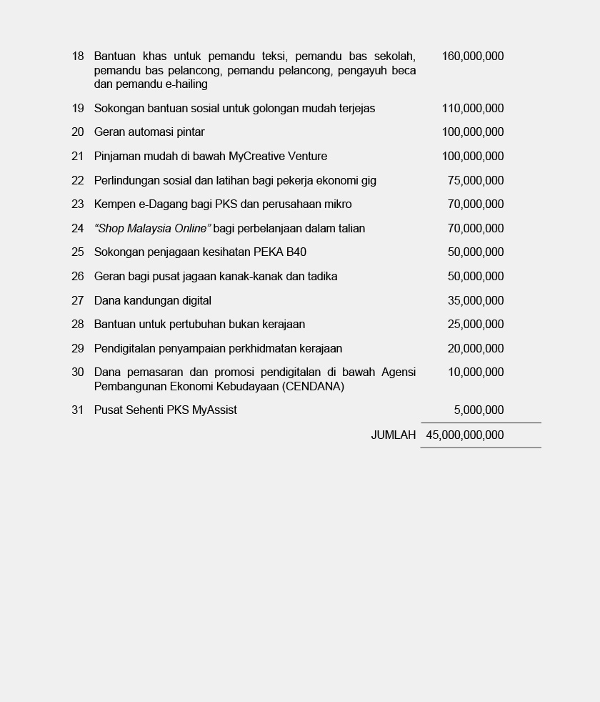 Jika ditelusuri cadangan yang kami kemukakan, antara program yang memerlukan penambahan besar adalah seperti program subsidi upah, inisiatif pengekalan pekerjaan dan pengambilan pekerja, dan bantuan latihan yang perlu ditambah kepada RM33.6 bilion manakala Bantuan Prihatin Nasional serta peruntukan bagi Kementerian Kesihatan bagi perbelanjaan berkaitan COVID-19 masing-masing memerlukan amaun sebanyak RM22.4 bilion dan RM2 bilion. (Rujuk Lampiran A dan B)