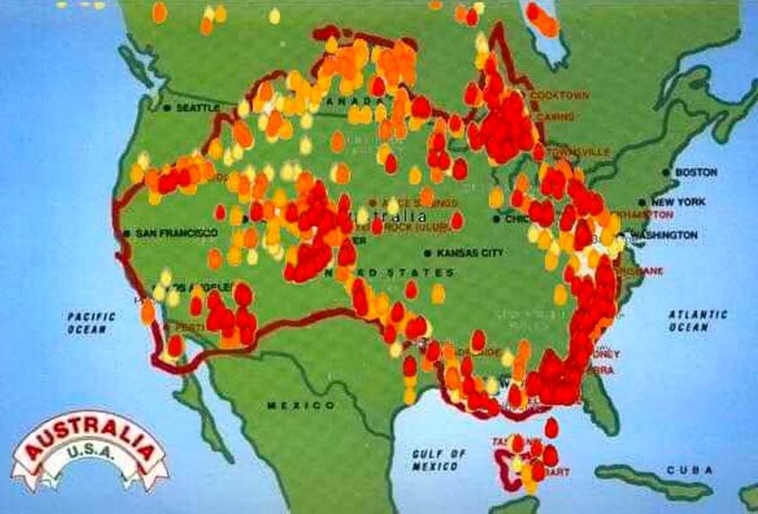 Terdapat beberapa usaha individu 'menampal’ peta benua Australia ke peta benua Eropah dan Amerika Utara bagi tujuan memberi sedikit gambaran perbandingan saiz dan betapa besar bala yang menimpa Australia.