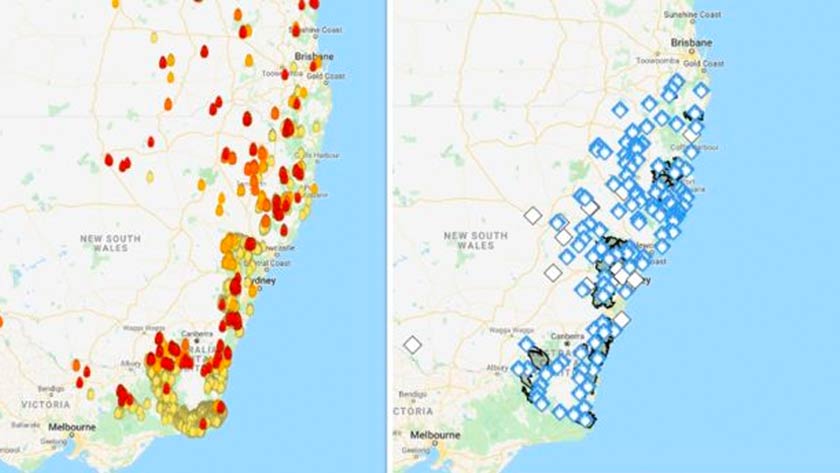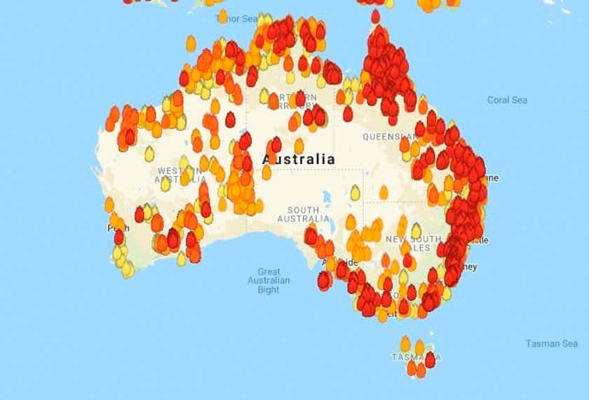 Salah satu peta kebakaran yang tular menggunakan ikon simbol api bertaburan di hampir kesemua pelosok benua Australia. Ini memberi gambaran seolah-olah satu benua sedang terbakar dan kawasan pantai seolah olah merah menyala dan tidak terkawal membara.