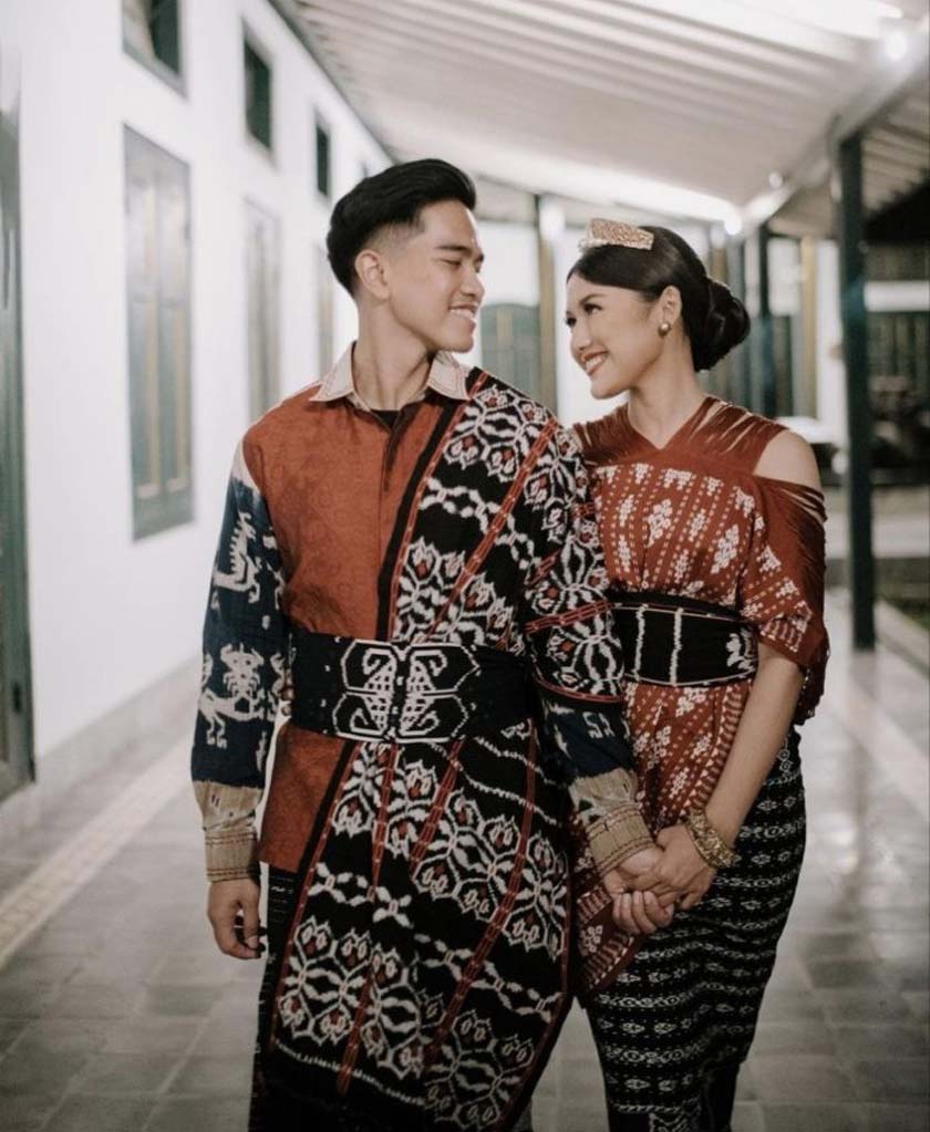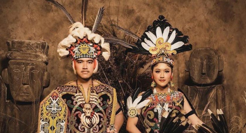 Erina Gudono & Kaesang Pangerap menggayakan pakaian dari adat Dayak, Kalimantan sempena foto pra perkahwinan mereka.