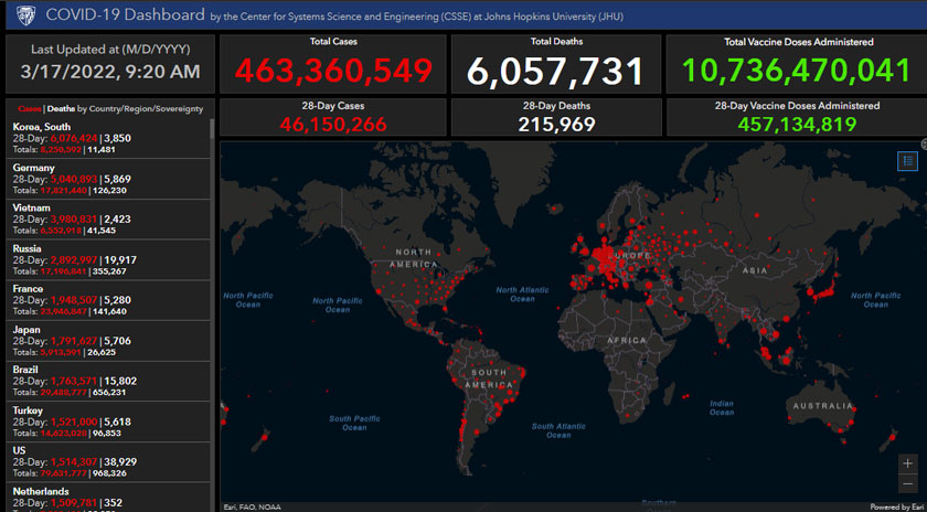 Ini menjadikan jumlah keseluruhan kematian akibat COVID-19 global kini melebihi 6.05 juta kes.