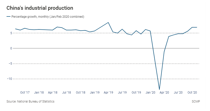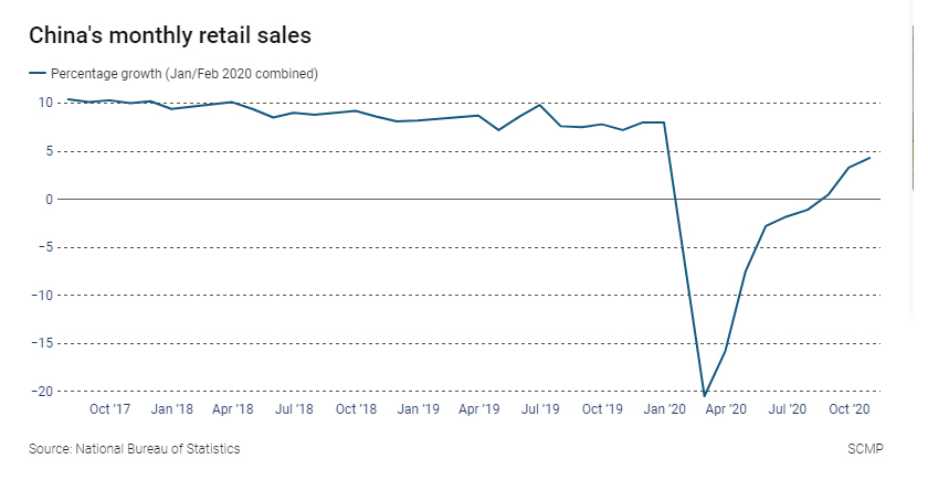 China juga mencatatkan peningkatan jualan peruncitan kepada 4.3 peratus pada Oktober 2020, berbanding tahun lalu, iaitu peningkatan berterusan selama tiga bulan berturut-turut.