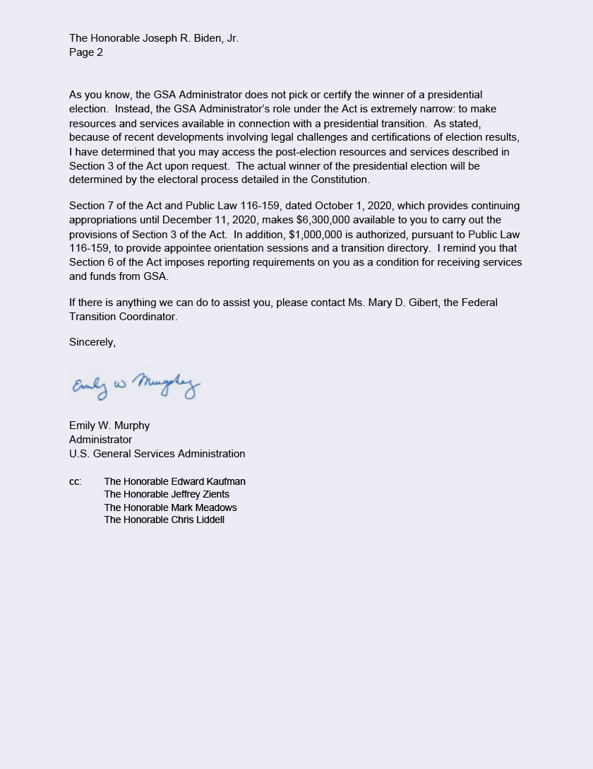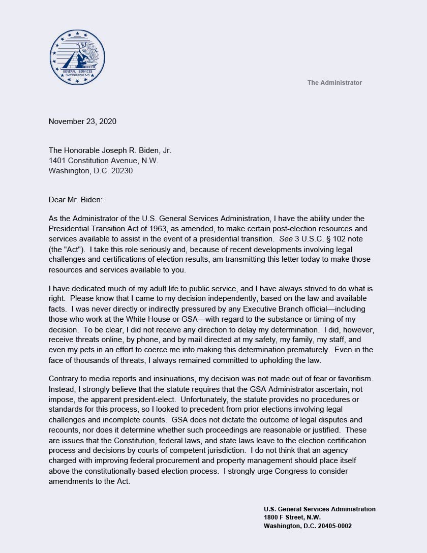 Ketua Pentadbir GSA, Emily Murphy memaklumkan mengenai perkara itu menerusi sepucuk surat yang dihantar kepada Biden pada Isnin (23 Nov), lebih dua minggu selepas beliau memenangi pilihan raya presiden yang diadakan pada 3 Nov lalu.