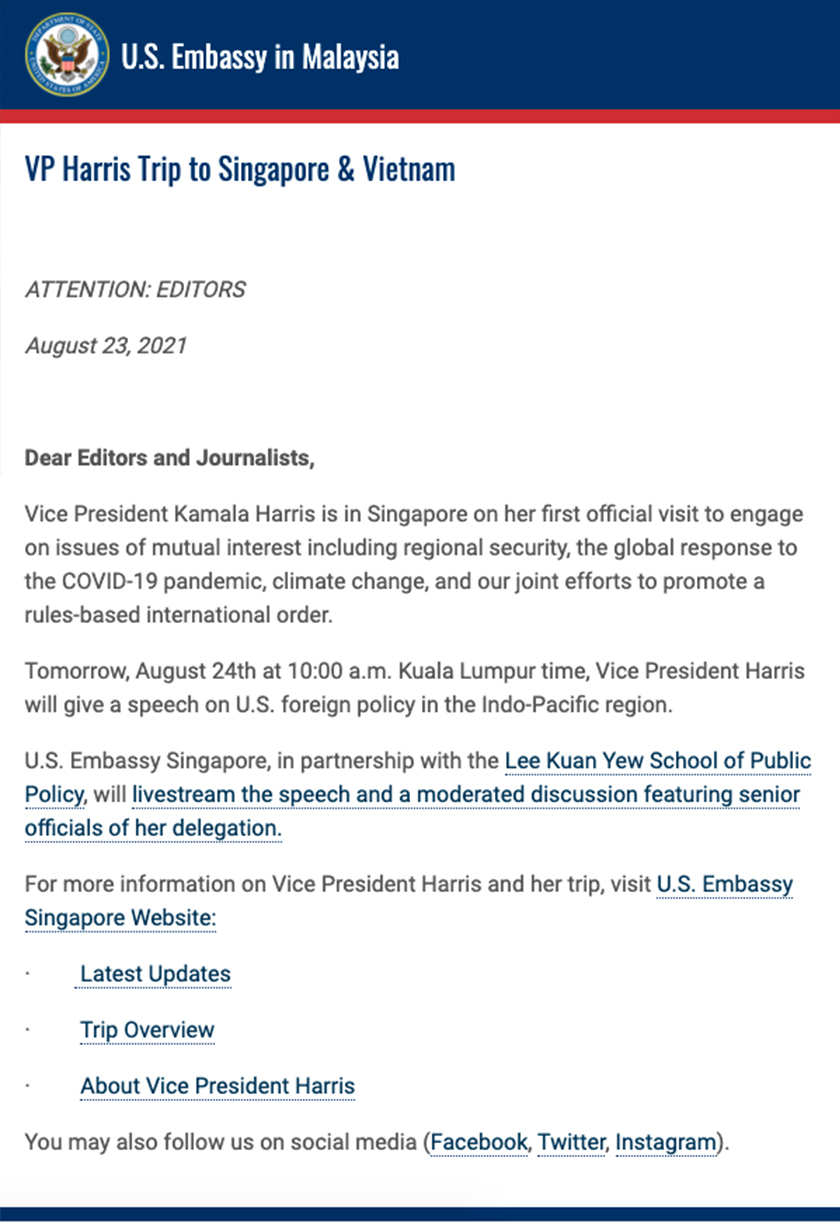 Dalam satu kenyataan dikeluarkan Kedutaan Amerika Syarikat di Malaysia, Harris berada di Singapura sempena lawatan rasminya ke dua destinasi di Asia Tenggara.