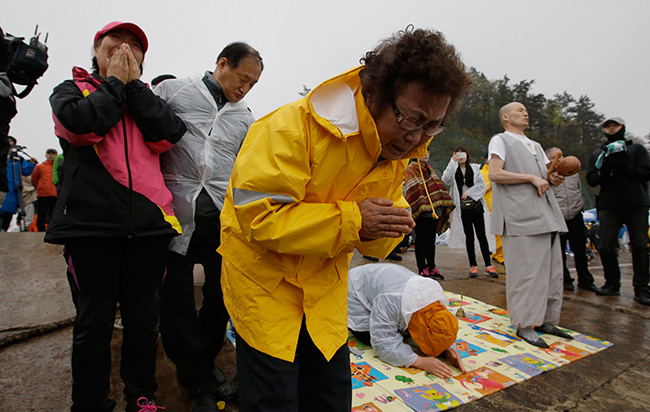 Keluarga kepada penumpang feri Korea Selatan yang karam pada 18 April di perairan selatan negara itu berdoa untuk keselamatan anak-anak mereka di pelabuhan Jindo. -Foto AFP/JUNG YEON-JE