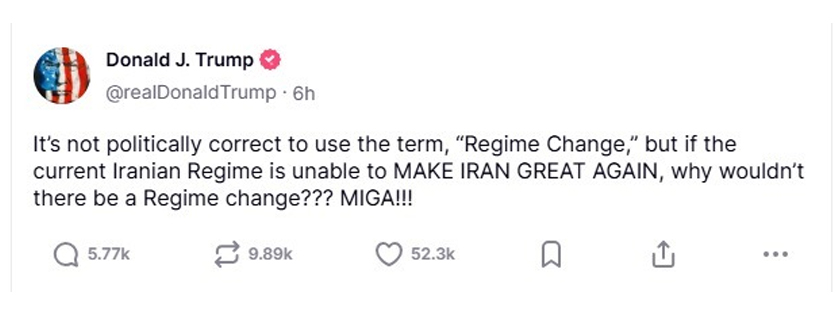Menerusi kenyataan yang dibuat beliau di platfrom media sosial Truth Social, beliau bermain bahasa bahawa serangan ke atas republik Islam itu bukannya pertukaran rejim, tetapi usahanya untuk menjadikan kepimpinan negara itu hebat semula dengan digantikan yang baharu.