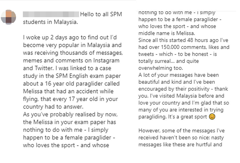 GARA-GARA kertas peperiksaan Bahasa Inggeris 2 bagi Sijil Pertengahan Malaysia (SPM) 2019, akaun media sosial Laura Melissa Williams dari London dibanjiri dengan ribuan komen oleh anak muda Malaysia.