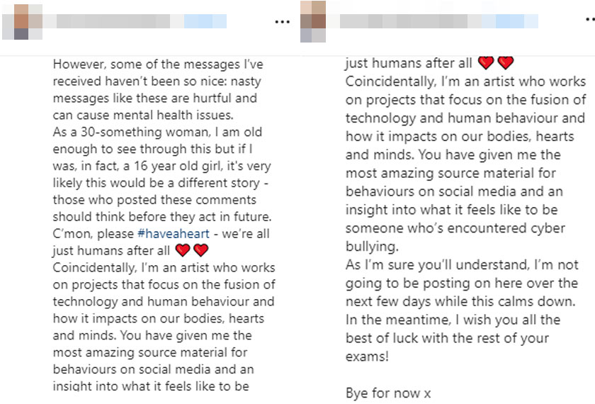“Apabila saya bangun, saya terima ribuan mesej daripada pelajar dari Malaysia - semuanya meminta maaf. Ada juga yang mengaku rasa menyesal kerana telah meninggalkan komen buruk,” kata Laura.
