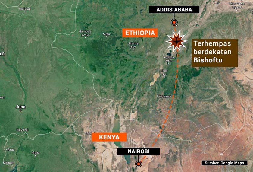 Pesawat itu terhempas berdekatan dengan Bishoftu, 60 km barat daya dari ibu kota.