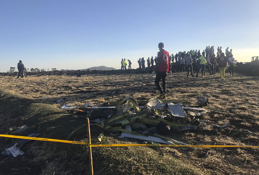 Pasukan penyelamat bergegas ke tempat pesawat Ethiopian Airlines terhempas di Hejere, sejurus selepas ia berlepas. - Foto AP/Yidnek Kirubel