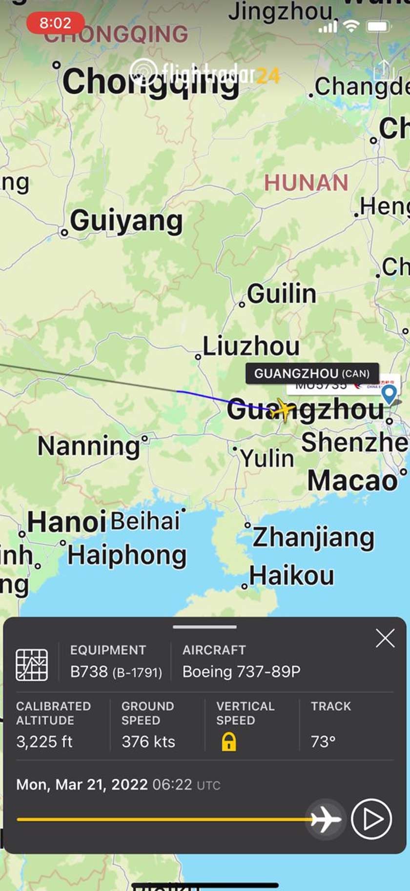 Menurut perkhidmatan penjejak penerbangan FlightRadar24, pesawat China Eastern MU5735 itu sedang dalam penerbangan dari Kunming ke Guangzhou.