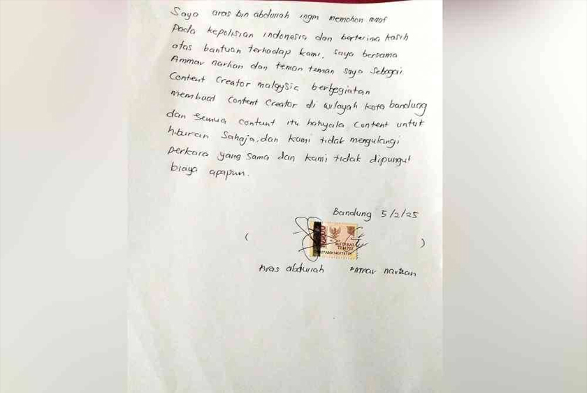 Surat permohonan maaf pempengaruh berkenaan yang diserahkan kepada polis. - Agensi