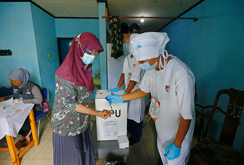 “Biarpun begitu, Bawaslu (Badan Pengawas Pemilihan Umum) dan KPU (Komisi Pemilihan Umum) sudah menyiapkan protokol kesihatan untuk mencegah penyebaran wabak COVID-19 dengan menyediakan pensanitasi tangan dan pelitup muka secara percuma kepada rakyat.