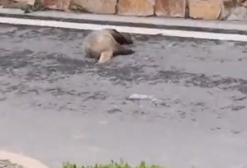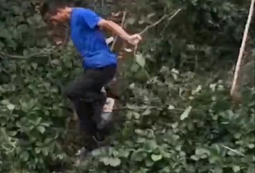 Video yang dirakam oleh pengunjung menunjukkan seorang lelaki memakai baju biru sedang menyeret seekor teledu keluar dari semak sebelum melontarnya ke jalan.