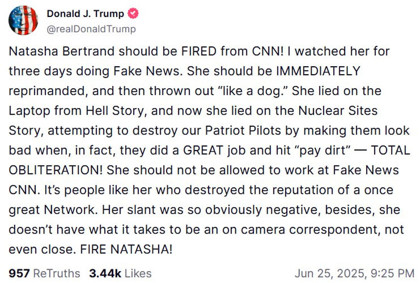WASHINGTON: Presiden Amerika Syarikat (AS), Donald Trump, menggesa agar wartawan keselamatan negara CNN, Natasha Bertrand, dipecat selepas beliau melaporkan penilaian awal risikan yang mendakwa serangan udara AS ke atas kemudahan nuklear Iran hanya menjejaskan program tersebut selama beberapa bulan sahaja.