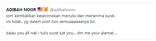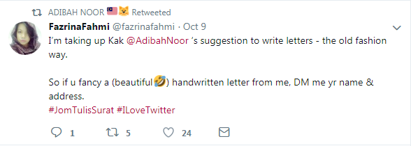 "Kalau anda semua nak surat yang ditulis sendiri oleh saya, sila hantarkan nama dan alamat menerusi 'DM' ke akaun Twitter saya," tulisnya.