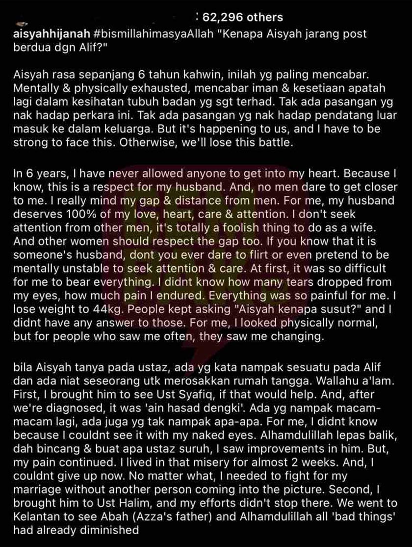 Dalam hantaran yang sama, Aisyah juga memaklumkan telah membawa Alif berubat dan diberitahu suaminya itu terkena perbuatan ‘hasad dengki’.