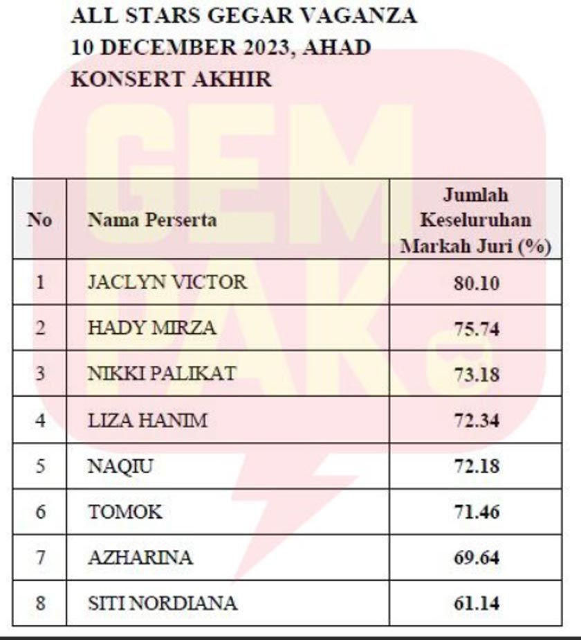 Berikut merupakan markah penuh semua bintang finale All Stars Gegar Vaganza:
