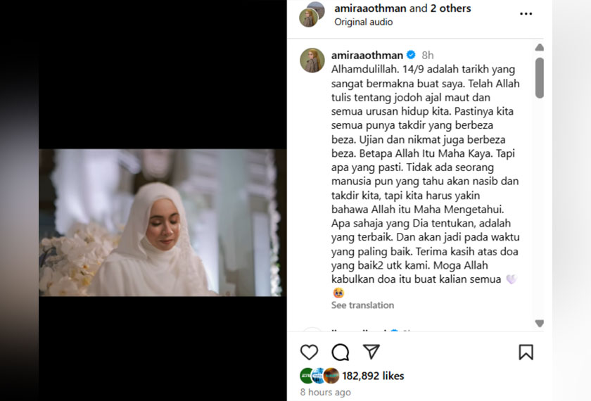 Dalam satu hantaran di Instagram, Amira berkongsi bahawa setiap urusan hidup manusia telah ditentukan oleh Allah, termasuk jodoh, ajal dan rezeki.
