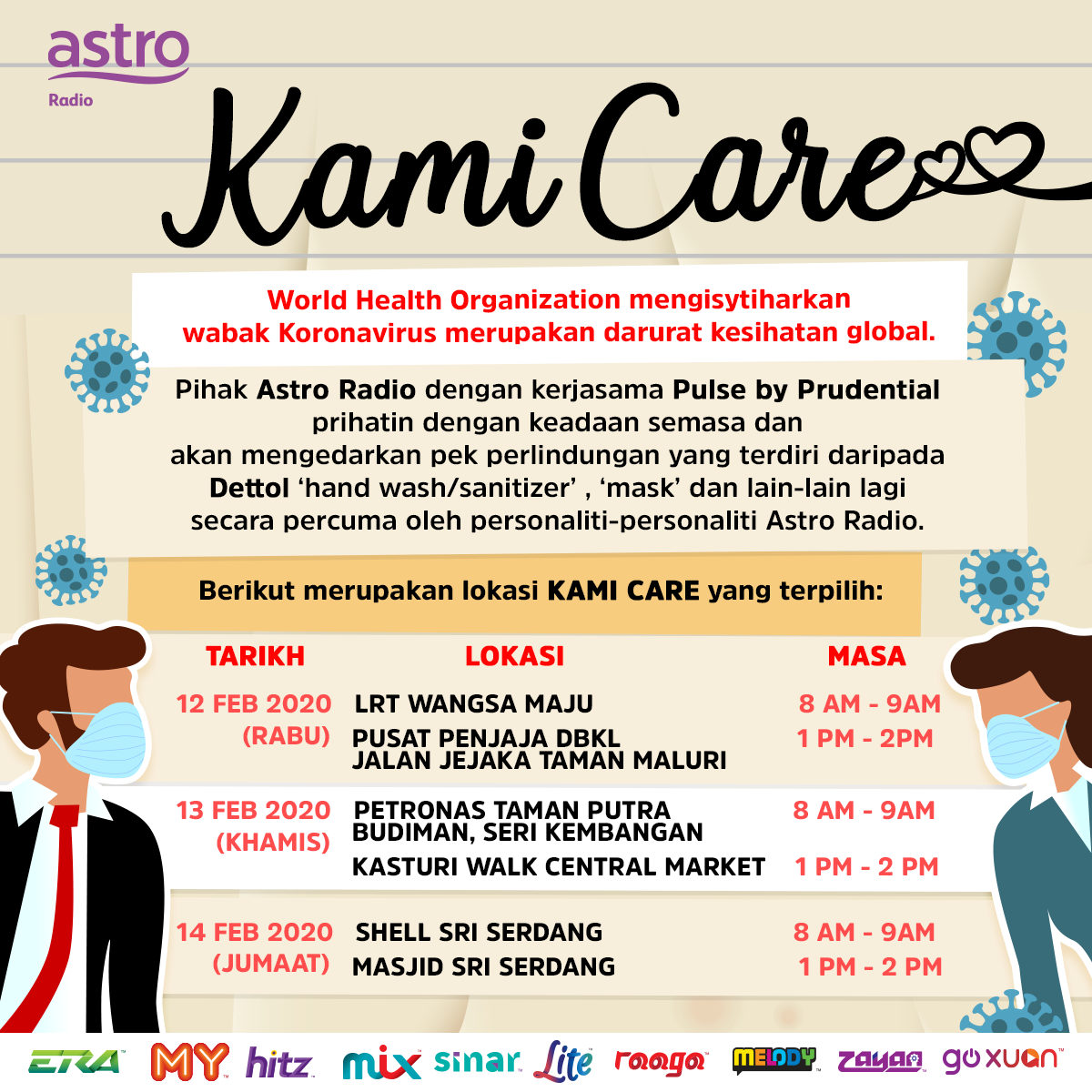 PIHAK Astro Radio dengan kerjasama Pulse by Prudential and Dettol melancarkan kempen ‘Kami Care’ dari 10 hingga 22 Februari 2020 dalam membantu rakyat Malaysia mengambil langkah berjaga-jaga untuk memerangi wabak penyakit berjangkit baru-baru ini.
