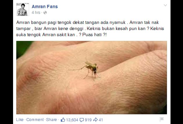 "Amran bangun pagi tengok dekat tangan ada nyamuk . Amran tak nak tampar, biar Amran kene denggi . Keknis bukan kesah pun kan ? Keknis suka tengok Amran sakit kan . ? Puas hati ?!," katanya di dalam catatan itu.