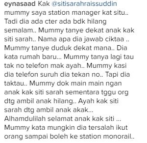 “Janji anak-anak saya selamat. Kalau ada yang jual harness tu tolong bagi tau kat sini. Terima kasih kepada Puan Aisyah staff monorel yang menjaga Talita,” tulis Sarah.