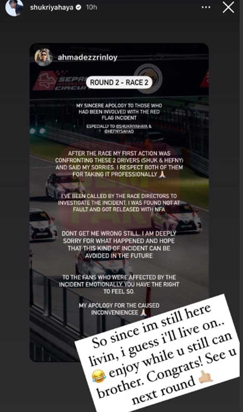 “Selepas perlumbaan, tindakan pertama saya adalah bertemu dengan kedua pemandu (Shukri, Hefny) dan memohon maaf kepada mereka. Saya menghormati kedua-duanya kerana mengambilnya secara profesional.
