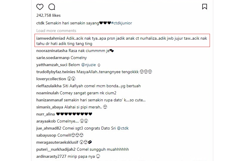 Antara yang menarik adalah pertanyaan seorang pengguna laman itu, iamwedahmiad yang bertanya 'Adik..acik nak tya..apa prsn jadik anak ct nurhaliza..adik jwb jujur taw..acik nak tahu dr hati adik ting tang ting.'