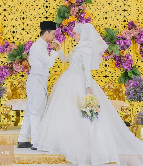 Pasangan itu pada mulanya menyarung busana berwarna putih dan dirai seperti di majlis pernikahan.