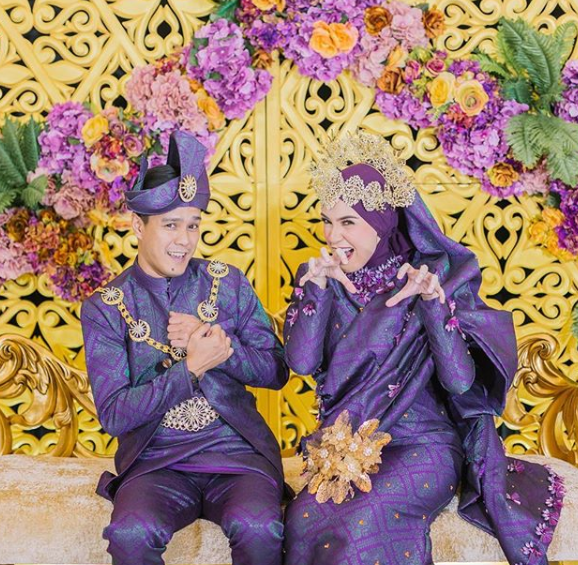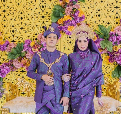 Kemudian mereka menukar baju ke persalinan songket berwarna ungu untuk majlis malam berinai mereka.