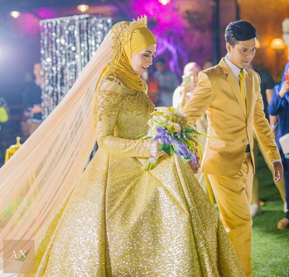 Di acara kemuncak malam tadi, pasangan ini sepakat mengenakan busana pengantin ketiga yang berwarna keemasan.