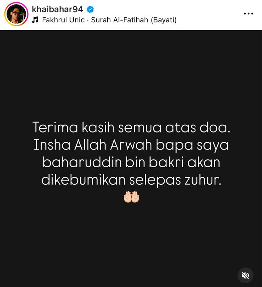 “Takziah buat Khai Bahar dan keluarga atas pemergian ayahanda tercinta. Semoga rohnya dicucuri rahmat dan ditempatkan dalam kalangan orang beriman. Al-Fatihah,” tulisnya.