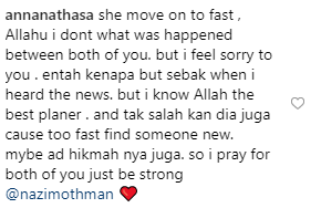 Dan di laman Instagram Nazim, lelaki berkenaan menerima banyak ucapan kata-kata semangat yang meminta dia banyak bersabar dalam menerima berita pertunangan bekas isterinya itu.