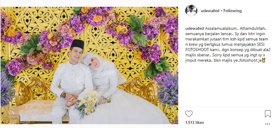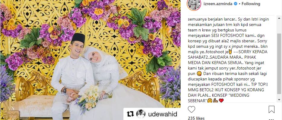 “Assalamualaikum. Alhamdulillah, semuanya berjalan lancar. Saya dan isteri ingin merakamkan jutaan terima kasih kepada semua team dan krew yang bertungkus-lumus menjayakan SESI FOTOGRAFI kami dengan konsep yang dibuat ala-ala majlis sebenar. Maaf kepada semua yang ingat saya tak jemput mereka… Bukan majlis ye… sesi fotografi je,” jelasnya.