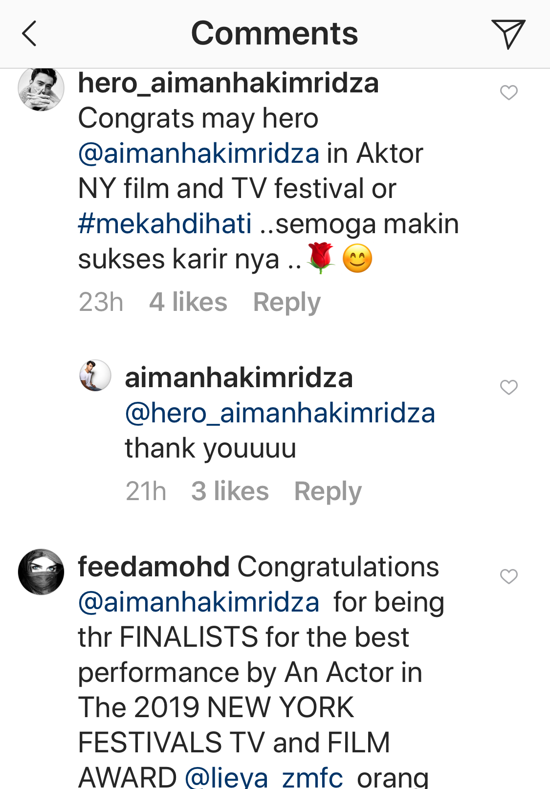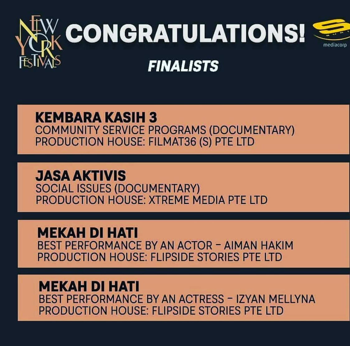 Terbaru, Aiman Hakim turut dicalonkan untuk The 2019 New York Festivals TV and Film Awards. Walaupun tidak memenangi anugerah tersebut, tersenarai sebagai finalis merupakan anugerah yang cukup besar.