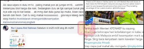 Malah alat pengesan suhu badan juga dijual dengan harga sehingga RM339 dan tisu basah anti bakteria naik melambung di antara RM45 sehingga RM65!