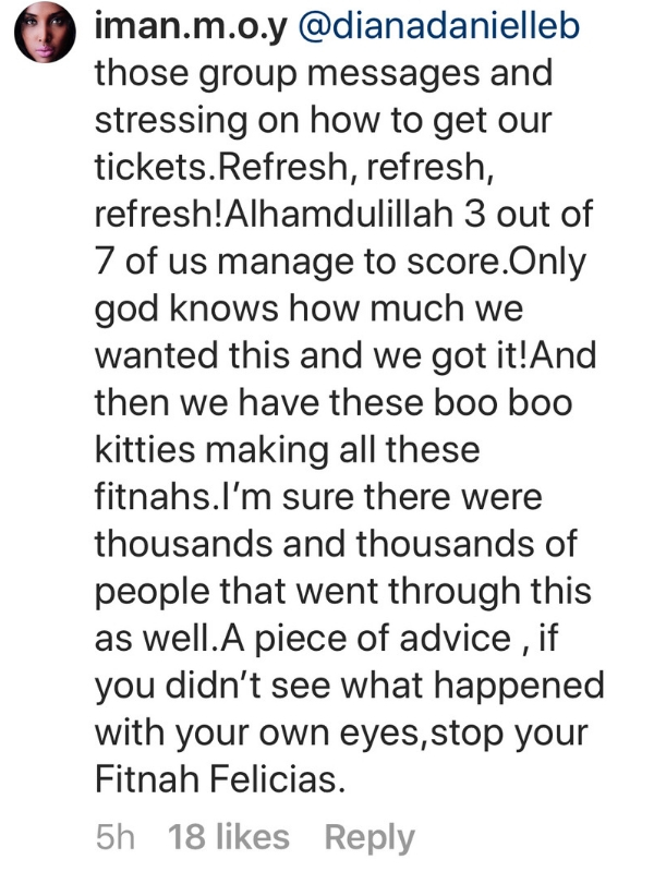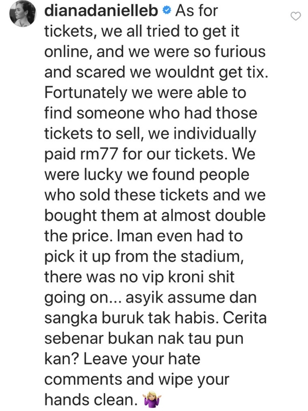 Ekoran itu, Diana meluahkan rasa sedih dan kecewanya kerana dituduh sedemikian sedangkan realitinya, dia dan Farid juga seperti peminat lain turut berusaha membeli tiket semata-mata kerana mahu ke stadium.