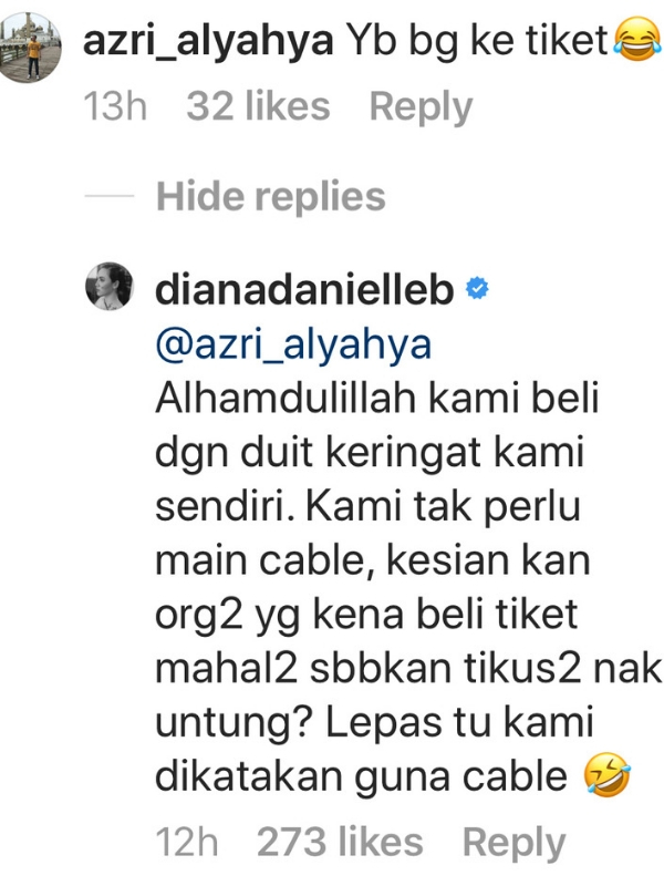 Dalam laman Instagram peribadinya, Diana menjawab kecaman yang dibuat kepadanya.