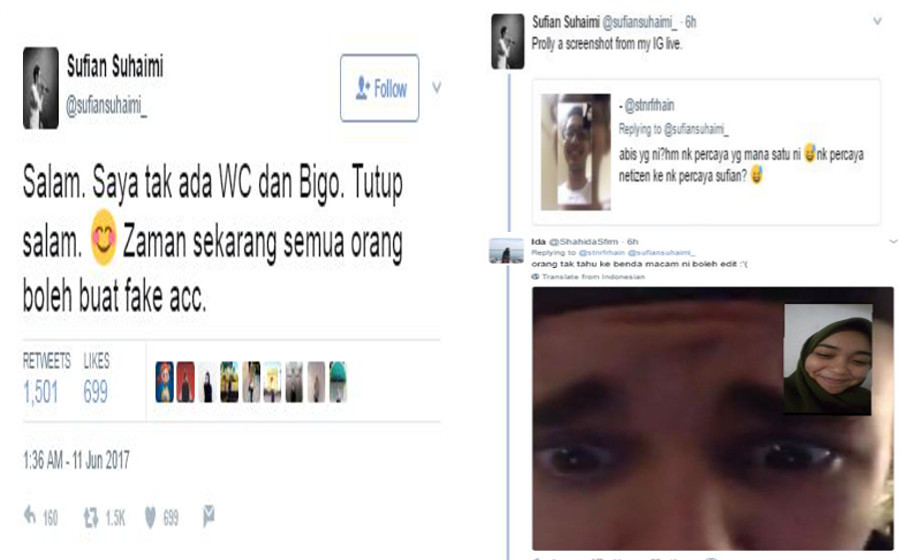 Menerusi kemas kini tersebut, Sufian menafikan mempunyai akaun Bigo seperti yang didakwa, serta turut menjelaskan paparan skrin 'video chat' yang dimuat naik lelaki tersebut di Twitter diambil daripada video live Instagramnya.