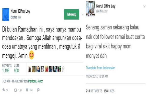 Sementara itu, mungkin kerana tidak suka namanya dikaitkan, pelakon Elfira Loy turut memuat naik entri di Twitter membela Sufian dan mendoakan dosa orang-orang yang memfitnah, mengutuk dan mengeji diampunkan.