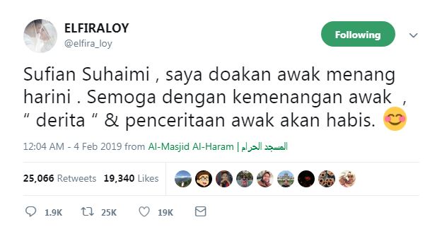 Menerusi laman sosial Twitter, Elfira mendoakan agar Sufian menang di Anugerah Juara Lagu 33 (AJL 33) dan dengan kemenangan itu, 'derita' dan penceritaan Sufian akan habis.