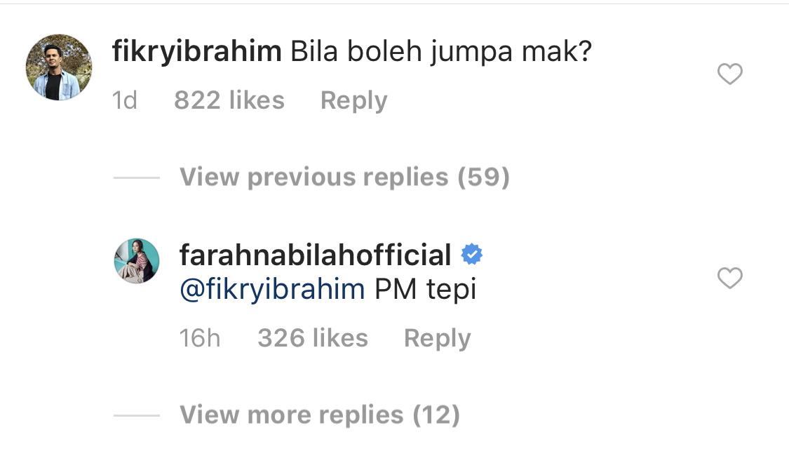 Pada masa yang sama, Farah turut meninggalkan komen di laman Instagram Fikry ketika jejaka itu memuat naik fotonya bersama ibu.