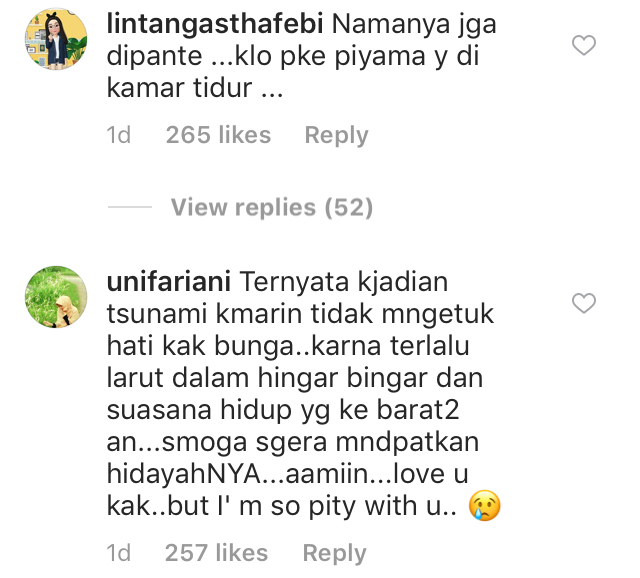 Tidak cukup kecaman bersifat peribadi, ada antara pengguna yang 'menyekolahkan' suami Bunga, pelakon Ashraf Sinclair agar menjaga aurat isterinya.